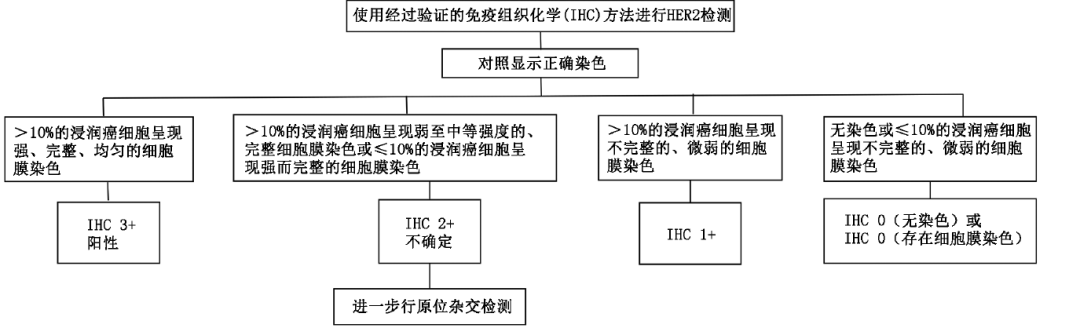 IHC 2+:须进一步进行ISH检测。若ISH扩增,为HER2阳性;ISH未扩增,为HER2阴性属于“HER2低表达”