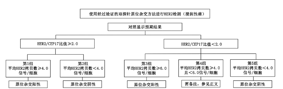 推荐意见:使用同时含有HER2基因和CEP17序列的混合探针,组织中≥75%的细胞核显示出双色信号视为杂交成功,并且双色信号互为对照,癌与非癌细胞互为对照(证据质量:高,推荐强度:强)。