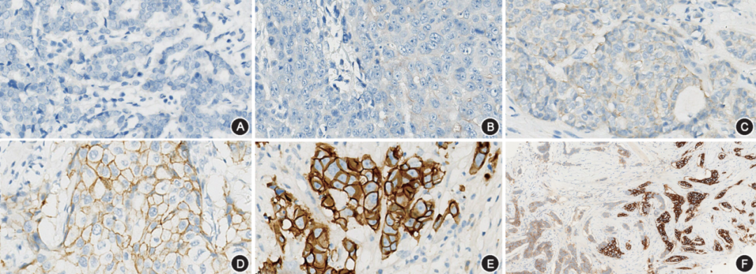 图2.浸润性乳腺癌HER2免疫组织化学(IHC)染色结果EnVision法;A示IHC 0,无染色高倍放大;B示IHC 0,存在细胞膜染色高倍放大;C示IHC 1+高倍放大;D示IHC 2+高倍放大;E示IHC 3+,无异质性高倍放大;F示IHC 3+,有异质性低倍放大