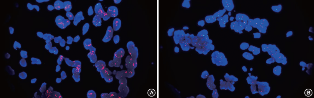 图5.浸润性乳腺癌HER2双探针荧光原位杂交检测结果FISH法高倍放大;A示阳性;B示阴性