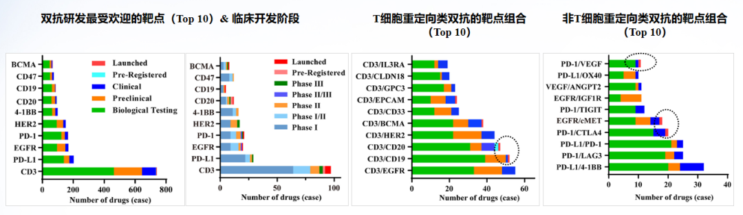 目前,全球双抗靶点开发聚焦T细胞重定向,而中国侧重双免疫检查点阻断,开发主要以实体瘤治疗为主,包括胃、胃食管结合部癌、膀胱癌、胆道恶性肿瘤、鼻咽癌等。