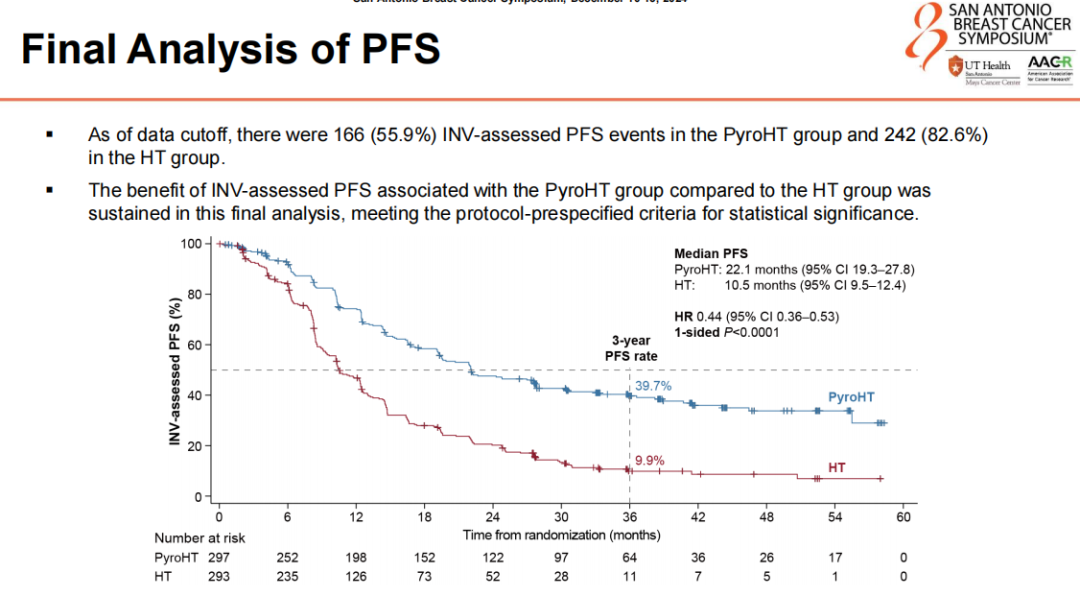 在HER2阳性乳腺癌治疗领域,我想分享两项来自中国学者的研究。首先是徐兵河院士报道的PHILA研究的最终PFS的数据,研究结果显示,PyroHT组与HT组的中位随访时间分别为35.7个月和34.3个月,PyroHT组和HT组研究者评估的中位PFS分别为22.1个月vs.10.5个月(HR=0.44,95%CI:0.36~0.53;P<0.0001),显著的高于HT组,OS数据尽管还不是很成熟,也显示出良好的获益趋势。