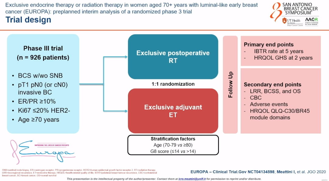 Icro Meattini教授:我是来自意大利佛罗伦萨大学的Icro Meattini。EUROPA是一项针对70岁及以上患者群体的III期临床试验。这些患者是一个非常特殊的群体,因为她们的治疗有时需要进一步优化,所以目前的指南建议这些患者接受保乳手术。如果乳腺癌患者为雌激素受体阳性(Luminal型乳腺癌),大多数患者会接受内分泌治疗,同时也通常会接受术后放射治疗。因此,EUROPA试验的目标是探索在仅使用内分泌治疗或放疗作为单一治疗方案时,对患者健康相关生活质量的具体影响。值得一提的是,生活质量是我们研究中采用的一个全新的主要终点。