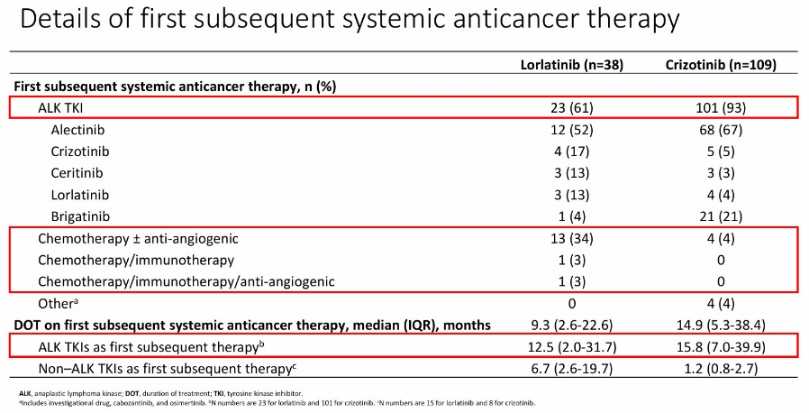 一线洛拉替尼治疗进展后有多种序贯方案可供选择,包括ALK-TKI、化疗±抗血管生成治疗、化疗+免疫治疗、化疗+免疫+抗血管生成治疗等。对于因疾病进展(PD)或其他原因停用洛拉替尼的患者,主要采用ALK-TKI和含化疗方案作为首个序贯疗法,其中首次序贯ALK-TKI或含化疗方案的比例分别为61%与39%;而克唑替尼组后续主要使用ALK-TKI。