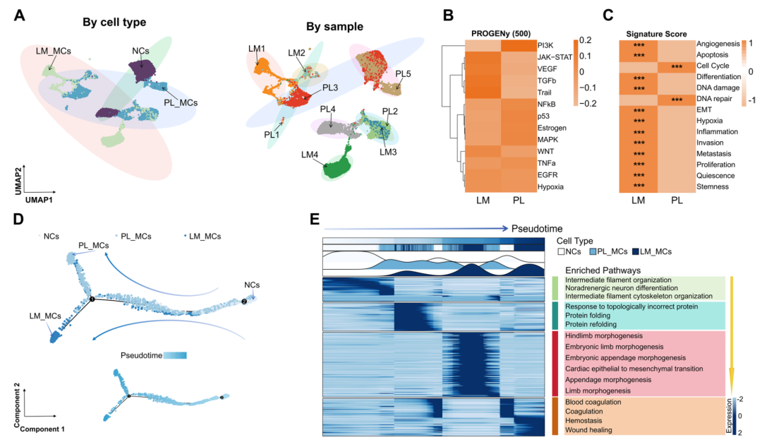 该研究还显示,原发肿瘤中的巨噬细胞(PL_MCs)和肝转移肿瘤中的巨噬细胞(LM_MCs)表现出肿瘤相关信号通路的不同激活。值得注意的是,COLEC11+基质癌症相关成纤维细胞(COLEC11_mCAFs)与LM_MCs显著相关,通过空间转录组数据、公共数据库队列及多重免疫组化/荧光分析,观察到这些细胞在肝转移灶中的显著积累。细胞信号通路分析揭示了COLEC11_mCAFs和LM_MCs之间潜在的可靶向受体-配体相互作用。COLEC11_mCAFs表现出与细胞外基质(ECM)相关基因的上调表达,如LUM、COL1A1和COL1A2,提示其功能可能与ECM重塑有关。值得注意的是,COLEC11_mCAFs在肝转移灶中与肿瘤细胞呈现共存模式,并在空间上表现出最强的相关性,提示这些成纤维细胞可能促进肿瘤细胞在转移环境中的生长和增殖。此外,高丰度COLEC11_mCAFs的患者队列,表现出更差的总生存期,表明靶向这一类肿瘤相关成纤维细胞,可能成为CRNELM患者的潜在治疗策略。