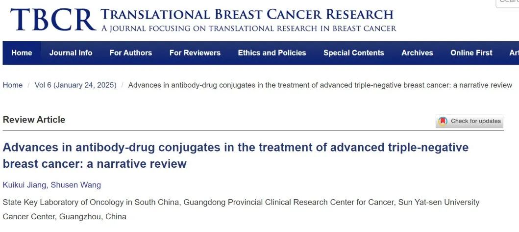 编者按:三阴性乳腺癌(TNBC)一直被认为是预后最差的乳腺癌类型,因为此类乳腺癌异质性强,缺乏明确有效的治疗靶点。尽管靶向、免疫治疗取得了一定的进展,但并未使晚期TNBC患者预后带来“质的飞跃”。抗体偶联药物(ADC)的更新迭代,为TNBC患者带来了新的治疗希望。近日,中山大学肿瘤防治中心王树森教授、蒋逵葵医生在《转化乳腺癌研究》(Translational Breast Cancer Research,TBCR)发表综述文章,总结了ADC治疗晚期TNBC的研究进展。《肿瘤瞭望》特邀王树森教授团队介绍该综述的亮点内容和精彩观点如下。
