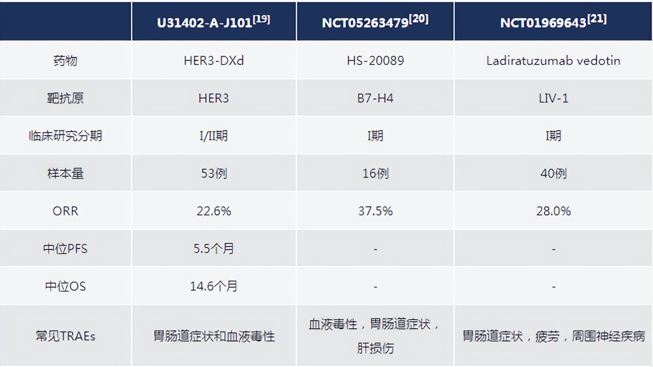 除Trop-2和HER2抗原外,目前还有HER3、B7-H4和LIV-1等其他抗原与ADC药物的研发相关,主要来自I/II期的早期研究探索。