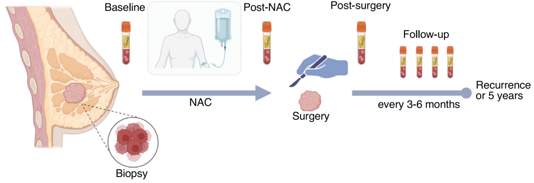 早期三阴性乳腺癌(TNBC)是预后最差的乳腺癌亚型。循环肿瘤DNA(ctDNA)已被证明可以预测乳腺癌的预后,但在TNBC中的应用价值和模式尚不清楚。本研究前瞻性地纳入了130例接受新辅助化疗(NAC)的II期至III期女性TNBC患者,并对其进行了全疗程多时间点的ctDNA监测。研究评估了基线、NAC后(术前)、术后及随访过程中ctDNA水平与预后的关系。