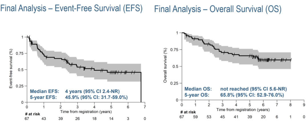 SAKK 16/14既往已发表的研究结果显示,该试验达到了1年无事件生存期(EFS)这一主要终点。1年EFS率从早期单纯化疗试验中的约50%提高到本试验的73.4%。我们目前已在巴黎的ELCC大会上公布了最终分析结果,中位随访期为6年。经过6年的中位随访,中位EFS为4年,中位总生存期(OS)尚未达到,病理学完全缓解率(pCR)为18.2%。主要病理缓解(MPR,定义为切除标本中残存活肿瘤细胞≤10%)的发生率超过60%。此外,pCR和MPR是预后的主要预测因素。pCR患者的中位EFS在中位随访6年后仍未达到。
