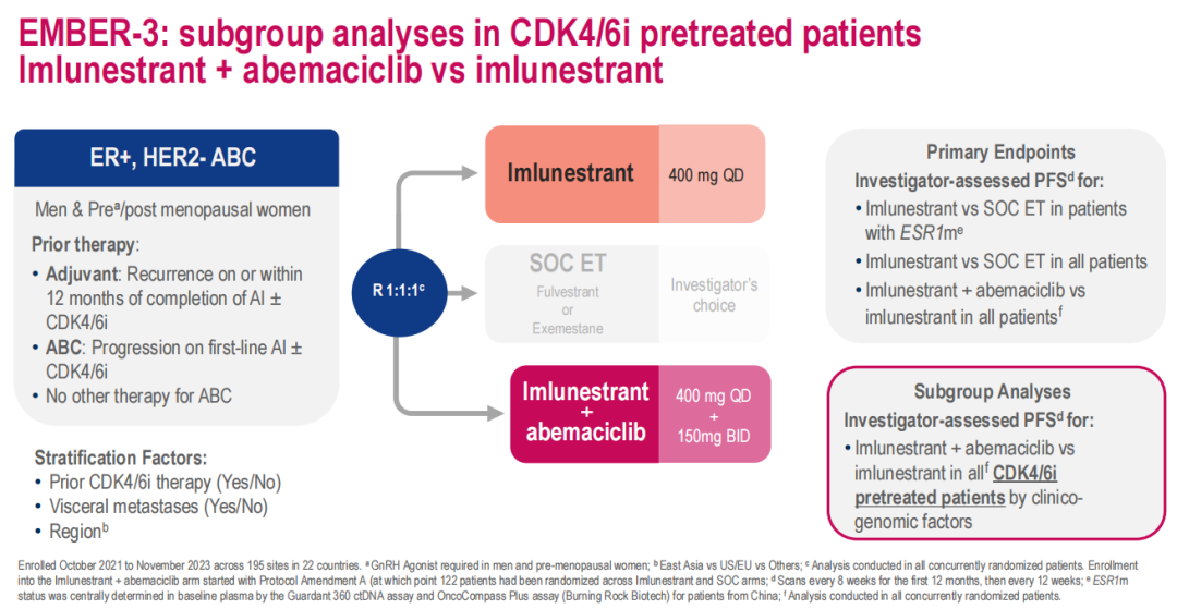 在既往接受过CDK4/6i治疗的ER+/HER2-晚期乳腺癌患者中,Imlunestrant+阿贝西利组较于Imlunestrant组表现出一致的获益,且不受临床基因组因素的影响。EMBER-3是首个在既往接受过CDK4/6i治疗进展后显示口服SERD+CDK4/6i联合疗法获益的III期试验。