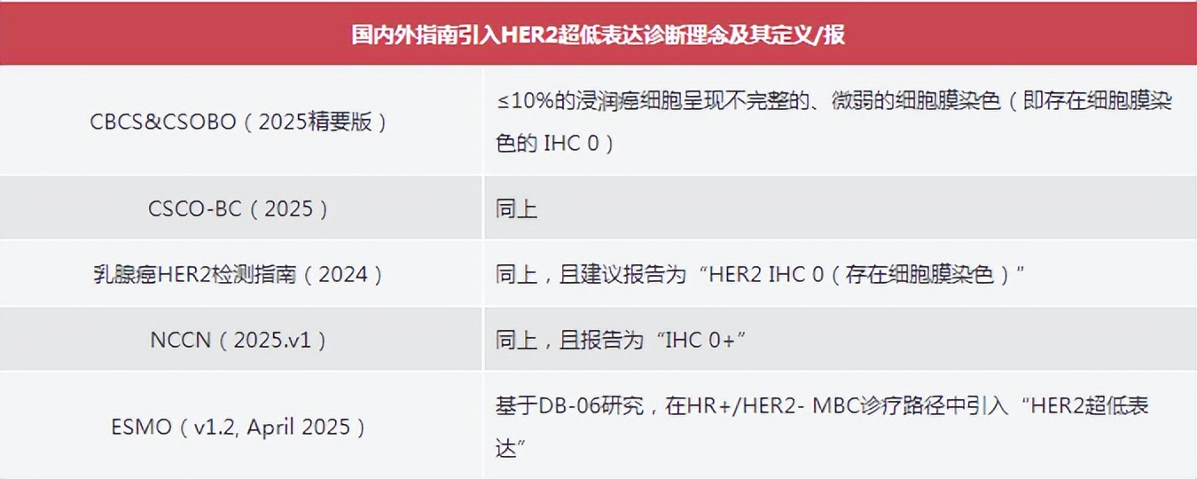 目前,《CBCS&CSOBO指南规范(2025精要版)》《CSCO-BC诊疗指南(2025)》《乳腺癌HER2检测指南(2024)》《NCCN乳腺癌指南(2025.v1)》《ESMO晚期乳腺癌在线指南(v1.2,April 2025)》等国内外权威指南[1-5],均引入了“HER2超低表达”的诊断和治疗理念。总体上,“HER2超低表达”的定义为:≤10%的浸润癌细胞呈现不完整的、微弱的细胞膜染色(即存在细胞膜染色的IHC 0)。