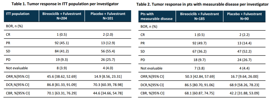 在近期疗效方面,意向性治疗人群(ITT)中,吡洛西利+氟维司群组的ORR高达45.6%,是氟维司群组(14.9%)的约三倍;而在具有可测量病灶患者中,吡洛西利+氟维司群组的ORR则高达50.3%,同样是氟维司群组(16.7%)的近三倍。