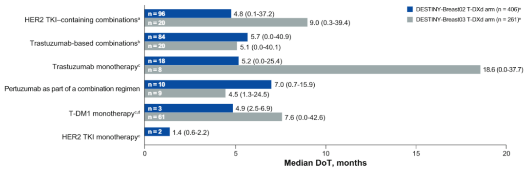 DB03研究后续可选抗HER2治疗为T-DM1(n=61)、曲妥珠单抗联合治疗(n=20)、HER2 TKI联合治疗(n=20)、帕妥珠单抗联合治疗(n=9)、曲妥珠单抗单药治疗(n=8)等,其中位DoT分别为7.6、5.1、9.0、4.5、18.6个月。