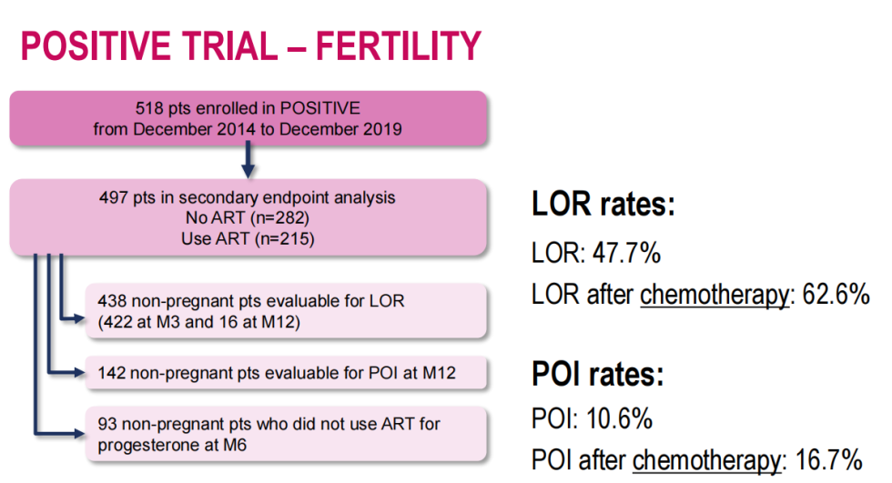 在POSITIVE研究中纳入的518名女性中,有438名患者符合LOR,142名患者符合POI。47.7%的患者出现LOR,且与较低的妊娠率相关[出现LOR的患者为65.5%,未出现LOR的患者为78.2%;比值比(OR):0.52;95%CI:0.31~0.87],尤其是在使用辅助生殖技术(ART)的患者中(出现LOR的患者为65.6%,未出现LOR的患者为84.7%;比值比:0.31;95%CI:0.14~0.68)。3个月时FSH升高在一定程度上降低了妊娠的可能性(比值比:0.96;95%CI:0.93~1.00),而其他因素没有观察到预测作用。在12个月时,仅有10.6%的患者出现POI,接受化疗的患者中这一比例为16.7%。