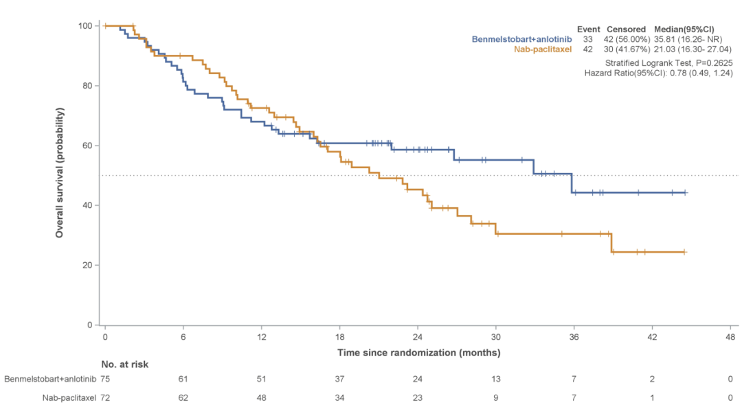 研究结果:本研究共147例患者完成随机分组,其中75例受试者接受贝莫苏拜单抗联合安罗替尼治疗(联合治疗组),72例接受白蛋白紫杉醇(对照组)治疗。在意向治疗分析中,研究者评估的中位PFS在联合治疗组为7.85个月,而对照组为5.55个月(HR=0.70;95%CI:0.46~1.06;P=0.1687)(图2)。