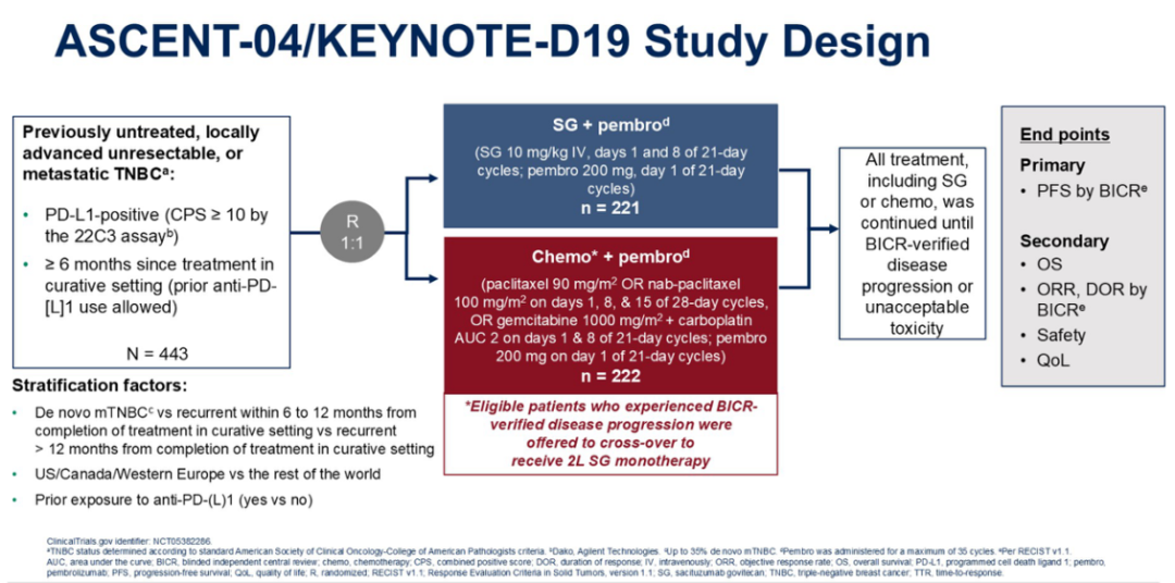 III期ASCENT-04/KEYNOTE-D19研究比较了SG/pembro与化疗/pembro作为PD-L1阳性、局部晚期不可切除或转移性TNBC患者的一线治疗方案的效果。