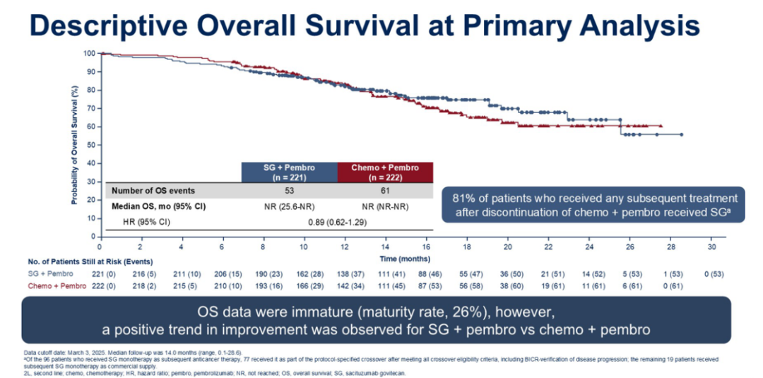 在分析时,总生存期(OS)数据尚不成熟,且对照组中有43%的患者在数据截止时已跨线使用SG单药治疗。然而,研究人员注意到SG/pembro相比化疗/pembro在OS方面有改善趋势(HR 0.89,95%CI:0.62-1.29)。