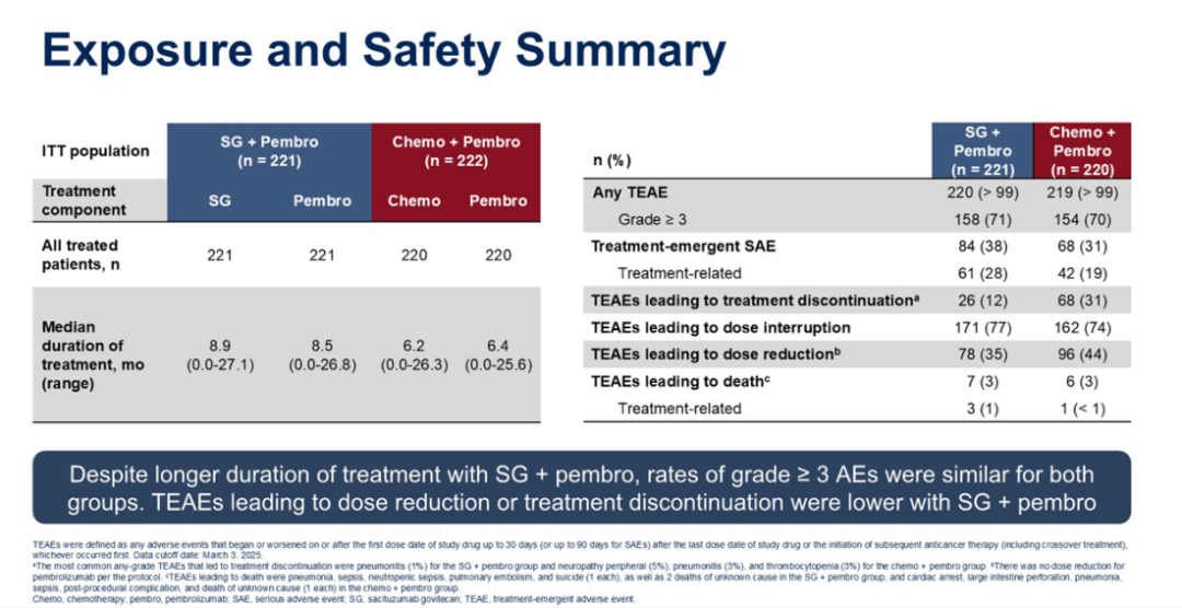 安全性结果与各药物的已知毒性特征一致,且未报告新的安全性信号。尽管SG/pembro与化疗/pembro相比,严重治疗相关不良事件的发生率较高(28%vs 19%),但SG/pembro在其他安全性指标上的发生率较低,包括导致治疗中断的治疗突发不良事件(12%vs 31%)和导致剂量减少的治疗突发不良事件(35%vs 44%)。