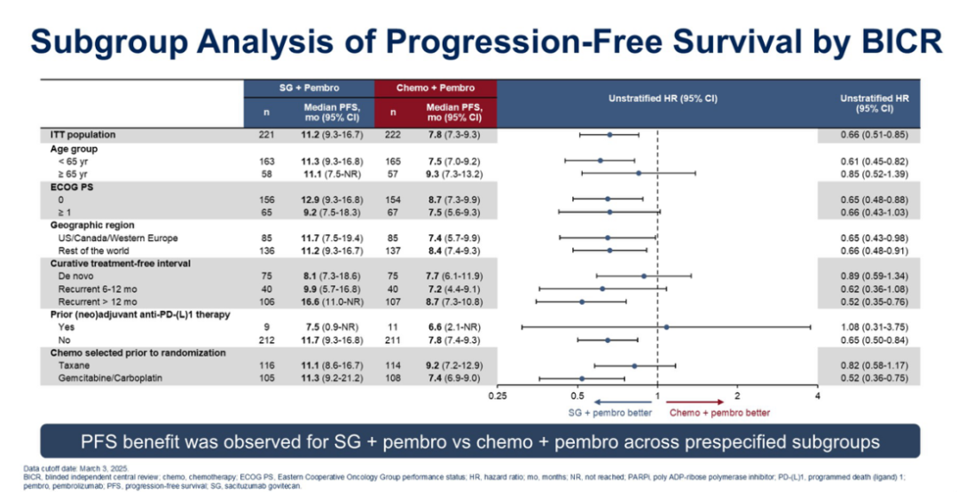 中位随访14.0个月后,本试验达到了主要终点,经BICR确认SG/pembro组与化疗/pembro组相比,中位PFS得到显著改善(11.2个月vs 7.8个月;HR 0.65,95%CI:0.51~0.84;P<0.001)。在亚组分析中,SG/pembro在大多数预设组中均观察到PFS获益。