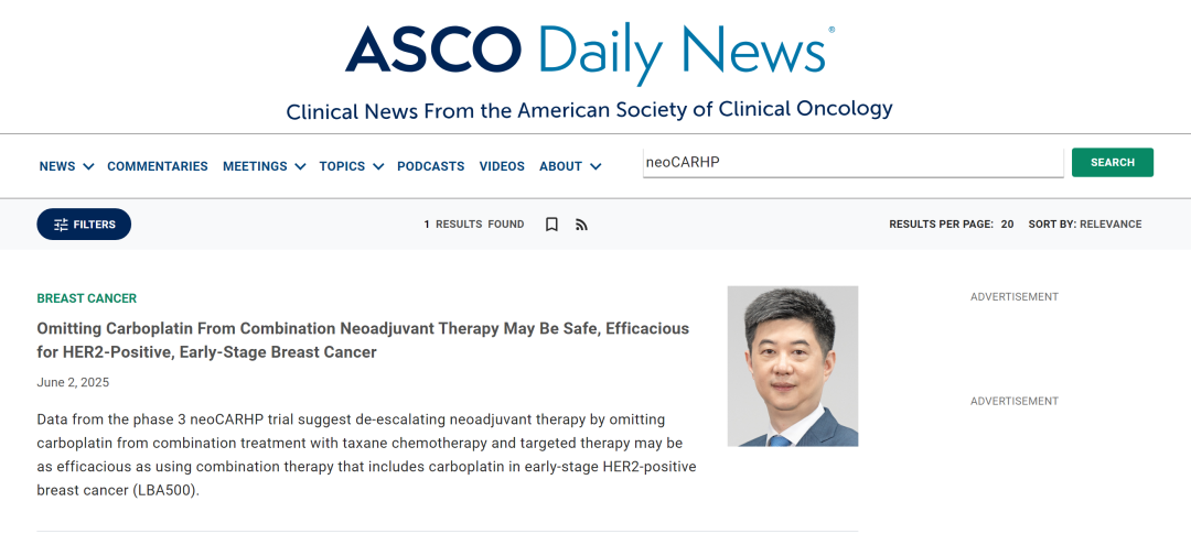 编者按:当地时间6月2日下午的ASCO大会早期乳腺癌口头报告专场中,广东省人民医院王坤教授以首位登场,报告了重磅研究(LBA500)neoCARHP。该研究首次在III期随机对照试验中比较了THP和TCbHP新辅助治疗,为HER2阳性乳腺癌“去卡铂”的双靶降阶梯治疗方案提供了重要循证医学证据。ASCO官网Daily News报道了该研究成果及讨论专家的观点。