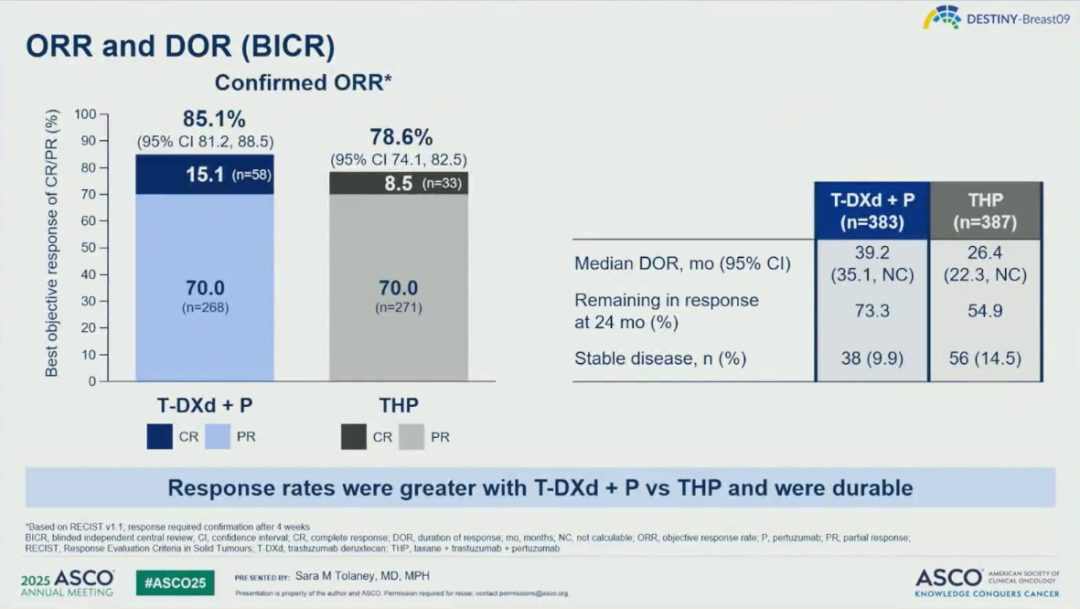 近期疗效方面,T-DXd+P组vs THP组的ORR为85.1%vs 78.6%;其中T-DXd+P组的完全缓解(CR)率相较于THP组提高了1倍(15.1%vs 8.5%);两组的中位持续缓解时间(DoR)分别为39.2个月和26.4个月。