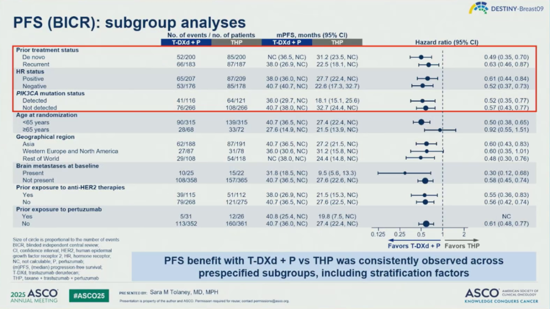 亚组分析显示,无论患者为初治或复发晚期患者、激素受体(HR)阳性或阴性、PIK3CA状态如何,T-DXd+P均有一致的PFS获益。PFS2方面,T-DXd+P组和THP组分别为未达到和36.5个月,疾病复发或死亡风险显著降低40%(HR 0.60,95%CI:0.45~0.79,P=0.00038)。OS尚未成熟(成熟度16%),目前已显示有一定的获益趋势(HR 0.84)。
