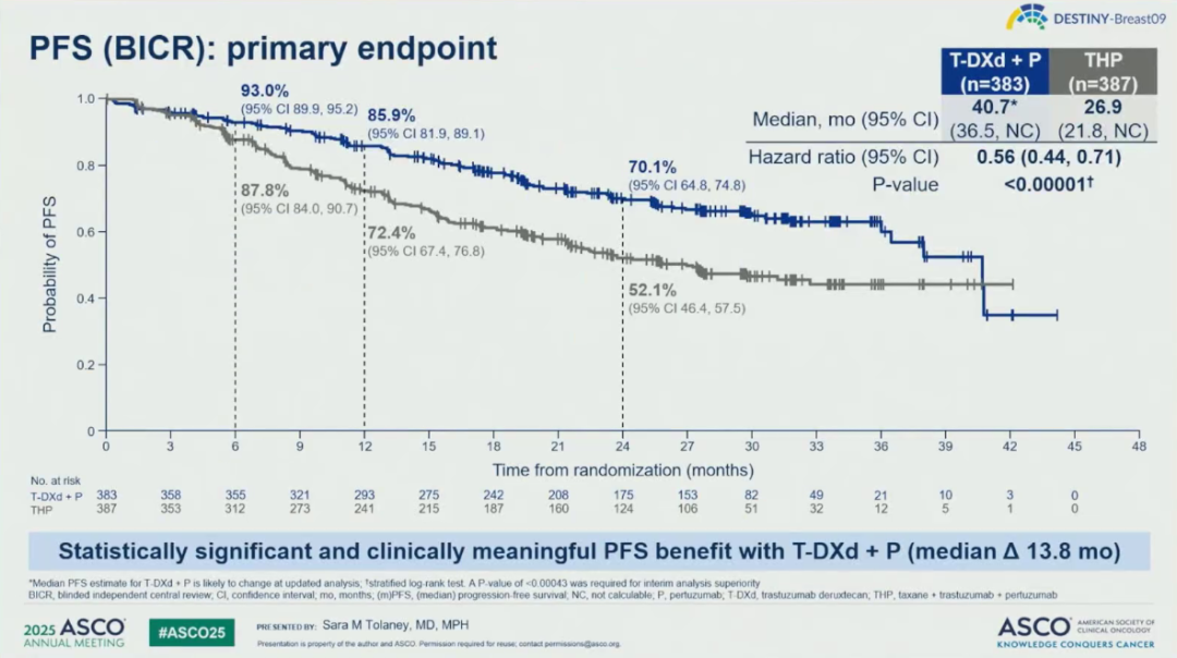 中位随访29.2个月显示,T-DXd+P组vs THP组BICR评估mPFS为40.7个月vs 26.9个月,疾病进展或死亡风险显著降低44%(HR 0.56,95%CI:0.44~0.71,P<0.00001);研究者评估的mPFS为40.7 vs 20.7个月,HR 0.49,95%CI:0.39~0.61,P<0.00001。