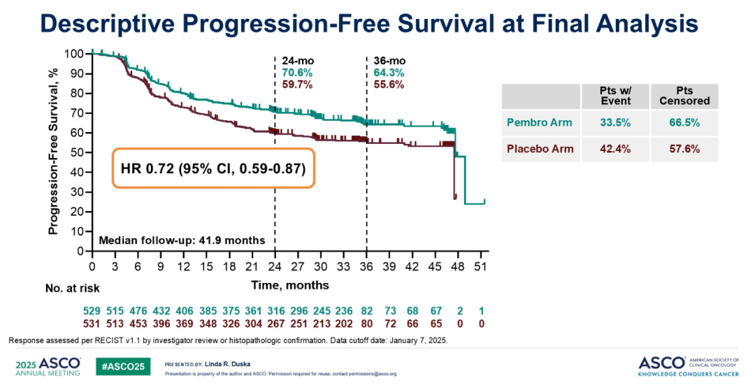 ☆最终分析的数据在2025 ASCO会议上分享,其数据截止日期为2025年1月。中位随访时间为41.9个月,PFS风险比为0.72(95%CI:0.59-0.87)。实验组和对照组的24个月PFS率分别为70.6%和59.7%,36个月PFS率分别为64.3%和55.6%。OS风险比为0.73(95%CI:0.57-0.94)。帕博利珠单抗组的36个月OS率为81.8%,安慰剂组为74.4%;48个月OS率分别为75.4%和70.2%。这些数据与之前的中期分析结果一致,并进一步支持将帕博利珠单抗联合CCRT作为该人群的新标准治疗方案。