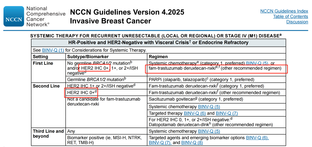 基于DB-06研究结果,2025年的NCCN指南和ESMO在线指南已经发生更新[7-8],且总体的建议一致:首先,两个指南均将T-DXd的应用人群从HER2低表达扩大至HER2超低表达;其次,两个指南都将T-DXd的应用,提前至ET失败或者内脏危象的患者。
