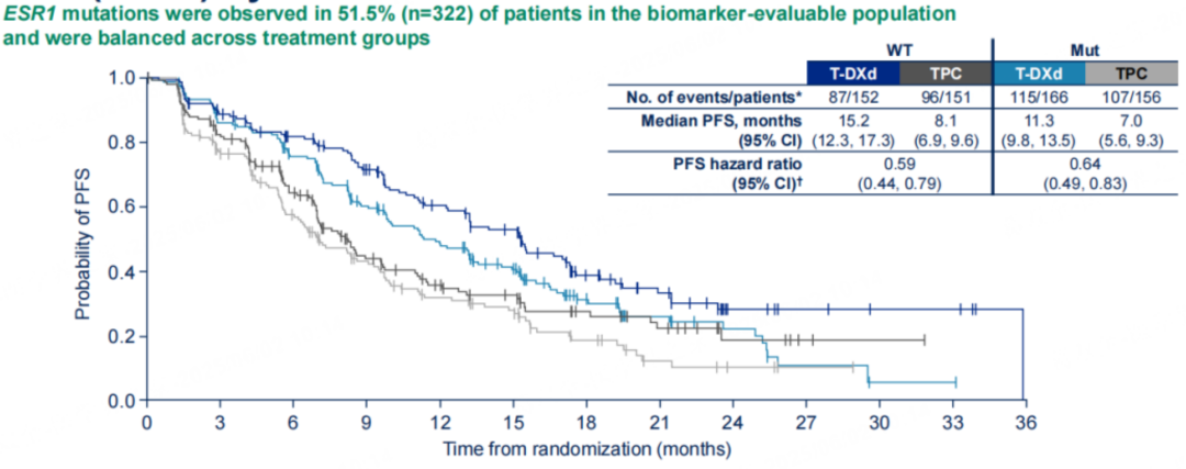 DB-06研究的这些探索性分析结果显示,针对不同耐药或致病突变的患者有一致的治疗获益,而且无论是“从前看”还是“往后看”,T-DXd都展现了克服耐药和减少交叉耐药的潜在治疗优势。