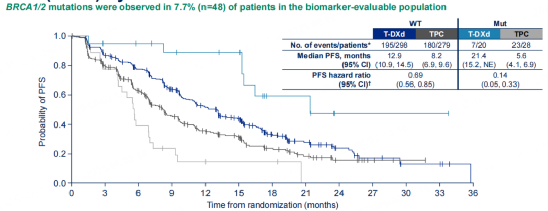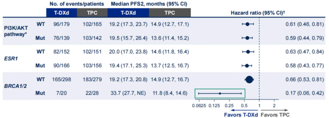 携带PI3K/AKT通路变异(19.5 vs 13.6个月,HR 0.59,95%CI:0.44~0.79)、ESR1突变(19.4 vs 13.7个月,HR 0.58,95%CI:0.43~0.77)、BRCA1/2突变(33.7 vs 11.8个月,HR 0.17,95%CI:0.06~0.42)的患者中,T-DXd组的PFS2相较于TPC组有不同程度延长,表明T-DXd治疗失败的患者,可能不会产生复杂的交叉耐药(Crosstalk),从而不会对后续治疗获益造成不利影响。