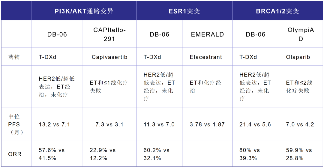 2025年ASCO大会报道了DB-06研究的生物标志物探索性分析[11]结果显示,在携带PI3K/AKT通路变异(57.6%vs 41.5%)、ESR1突变(60.2%vs 32.1%)、BRCA1/2突变(80%vs 39.3%)的患者中,T-DXd组的客观缓解率(ORR)均高于TPC组。