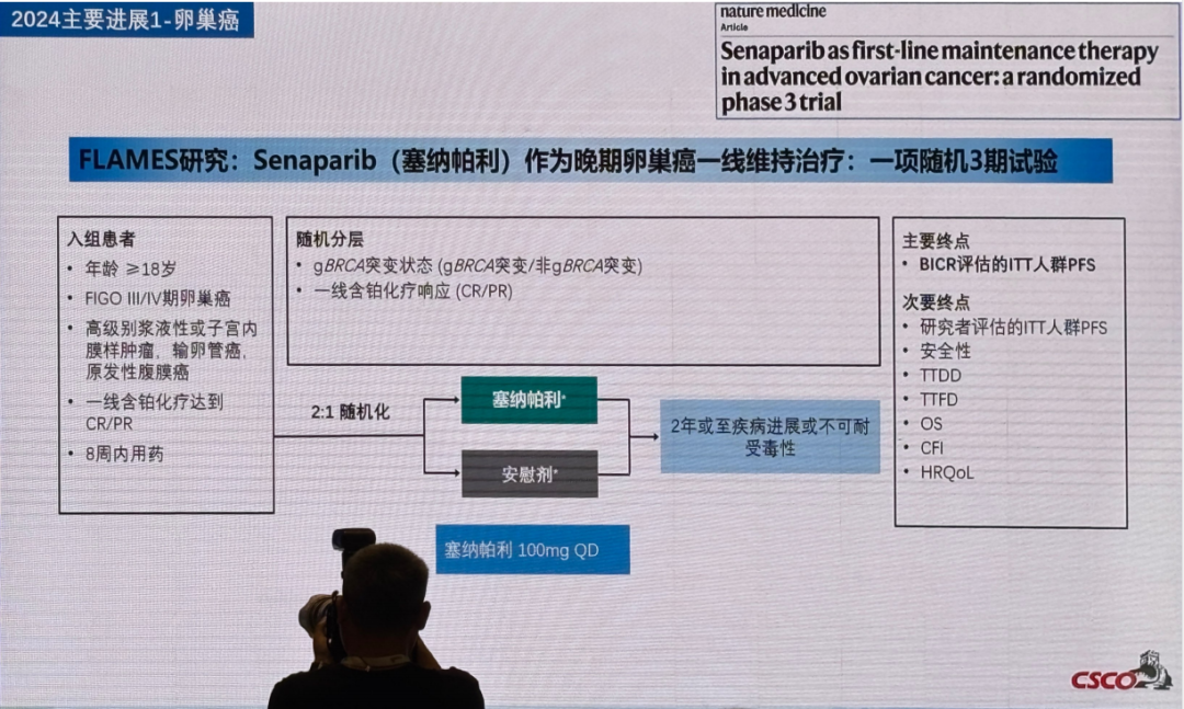 Senaparib(塞纳帕利)作为我国自主原创的全新PARP抑制剂,具有靶向性高和治疗窗宽的特点。由复旦大学附属肿瘤医院吴小华教授团队主持开展的Ⅲ期随机对照临床FLAMES研究探索了塞纳帕利对比安慰剂在中国晚期卵巢癌患者的一线维持治疗中的有效性和安全性。研究纳入404例国际妇产科联盟(FIGO)III–IV期且对一线铂类化疗达到完全缓解或部分缓解(CR/PR)的晚期卵巢癌患者,按2:1随机分配至塞纳帕利组(100mg QD,n=271)或安慰剂组(n=133),治疗最长2年。主要终点是由盲态独立中心审查评估(BICR)的无进展生存期(PFS)。