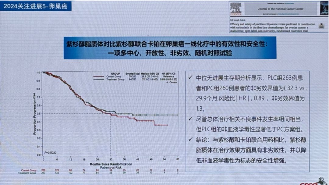 结果显示,在II-IV期原发性卵巢癌/腹膜癌/输卵管癌患者一线治疗中,PLC组的中位PFS为32.3个月,PC组为29.9个月(HR=0.89;95%CI 0.64-1.25)。HR的95%上限(1.25)小于预设非劣效界值(1.3),证实PLC方案疗效非劣于PC方案。且PLC组在恶心、呕吐、食欲减退、脱发、低钠血症、高甘油三酯血症、神经毒性方面的发生率显著低于PC组。提示紫杉醇脂质体联合卡铂可作为安全有效的一线替代方案。
