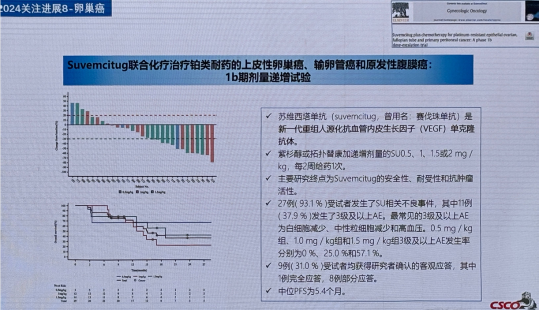 中国医学科学院肿瘤医院吴令英教授团队开展的这项1b期研究评估了新一代抗VEGF抗体Suvemcitug联合紫杉醇或拓扑替康治疗铂耐药卵巢癌。结果显示,在29例患者中,未发生剂量限制性毒性。最常见特别关注不良事件为蛋白尿(41.4%)、高血压(20.7%)和鼻出血(10.3%),无胃肠道穿孔发生。确认的ORR为31.0%(1例CR,8例PR),中位PFS为5.4个月。表明Suvemcitug具有可接受的安全性和有前景的抗肿瘤活性,相关数据支持其进一步临床研究的开展。