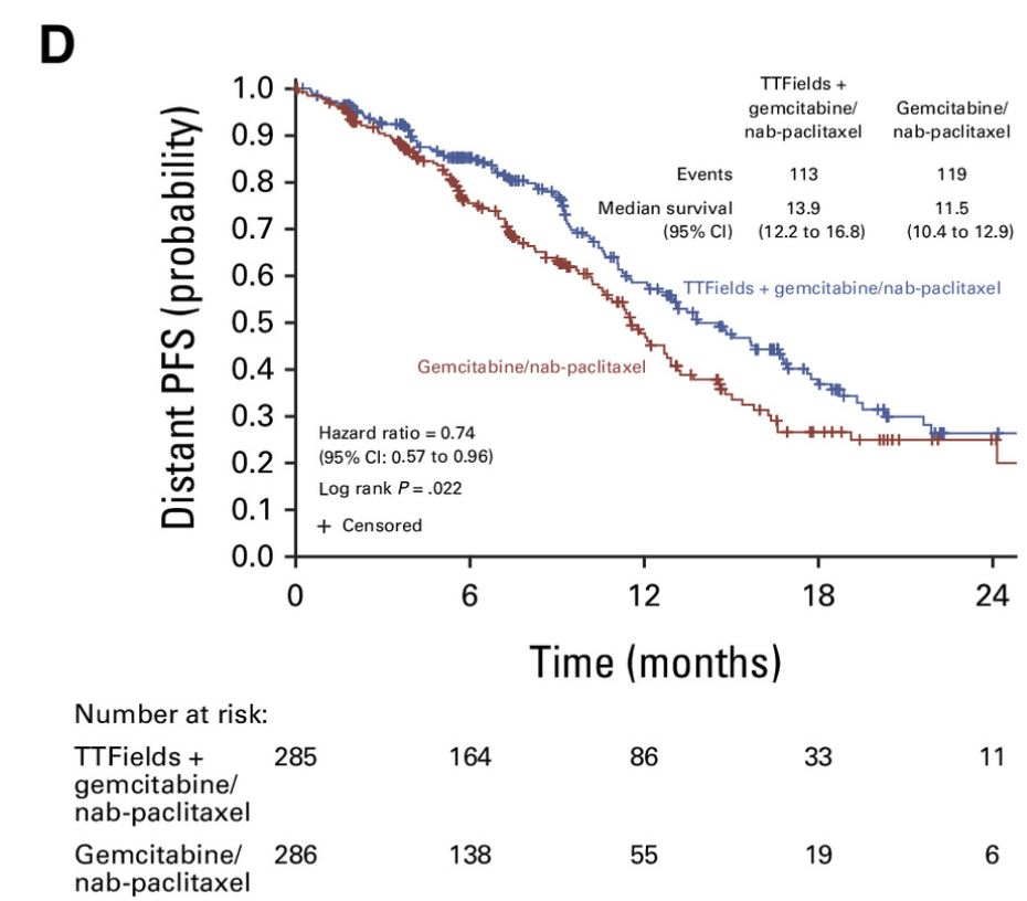 该研究TTFields组和单纯化疗组的mPFS无显著差异,为10.6个月vs 9.3个月,HR为0.84(95%CI,0.68-1.05),P=0.137;局部PFS亦无显著性差异(HR=0.84,P=0.151),可能与原发灶疗效评估困难有关。TTFields联合化疗组患者的远处无进展生存期(dPFS)达13.8个月,较单纯化疗组(dPFS为11.5个月)延长2.3个月,HR为0.74(95%CI 0.57-0.96),P=0.022(图6)。