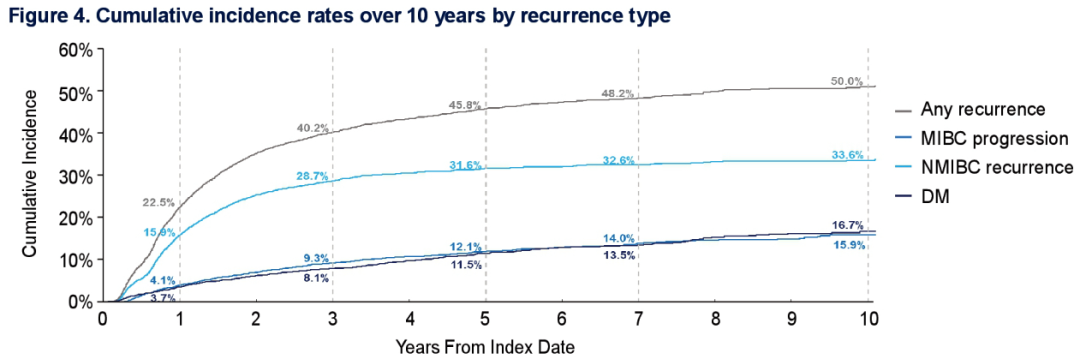 1年时,NMIBC复发的累计发病率为15.9%,MIBC进展的累计发病率为4.1%,远处转移的累计发病率为3.7%,10年时分别达到33.6%、15.9%和16.7%。