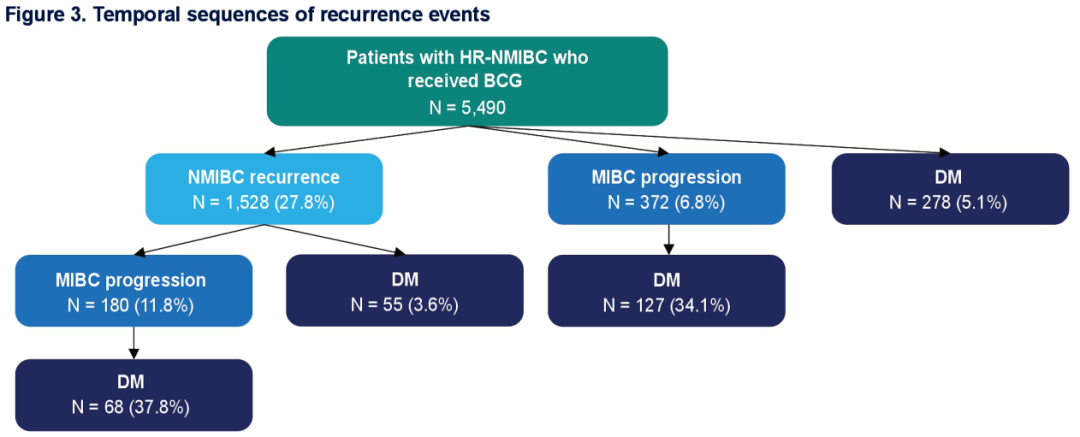 本研究对接受BCG治疗的高危非肌层浸润性膀胱癌(HR-NMIBC)患者进行了一项回顾性队列研究,以BCG起始日期为指标日期。开发了一种复发算法,用于识别和分类复发事件,包括NMIBC复发、肌层浸润性膀胱癌(MIBC)进展和远处转移。