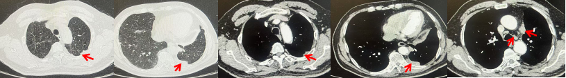 图6:患者胸膜及纵隔转移(2024.09)胸部CT肺窗及纵隔窗