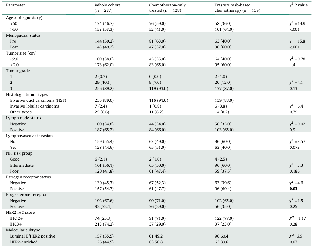 研究共纳入287例HER2阳性乳腺癌患者。根据是否接受抗HER2治疗,将病例分为两组:单纯化疗组(n=128)和以曲妥珠单抗为基础的治疗组(n=159)。