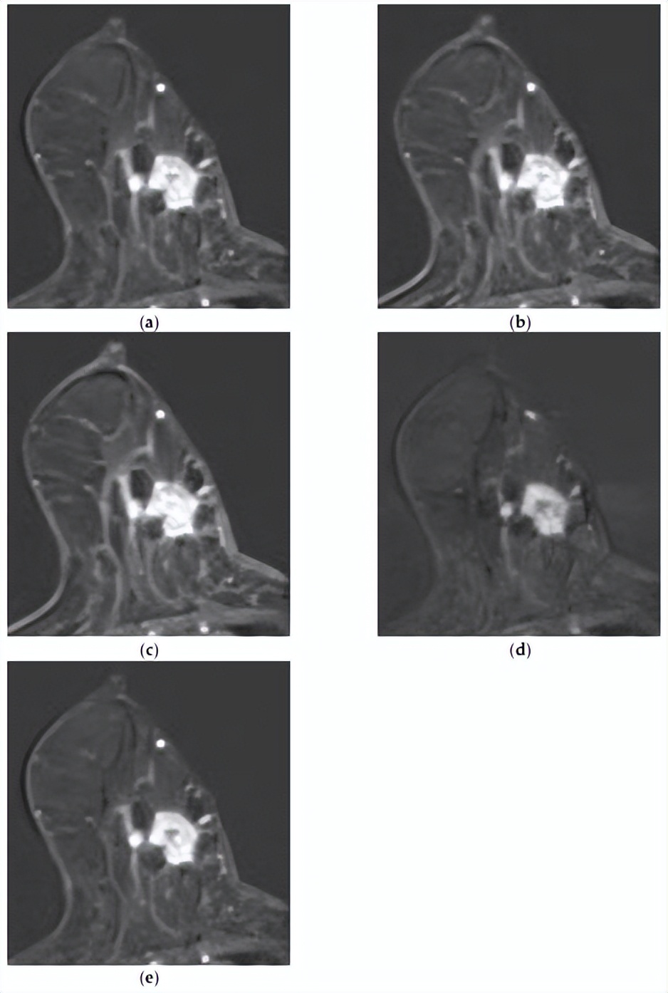 [组合模型正确预测了复发,而MRI模型则没有。一名73岁的女性,乳房几乎完全脂肪化,BPE极小。注射造影剂后(a)1分钟、(b)2分钟、(c)3分钟、(d)4分钟和(e)5分钟的轴向增强T1加权MR图像显示,右下内象限有一个1.4×1.7厘米的不规则形状、边缘不规则肿块,内部增强不均匀。病灶表现出快速的初始增强,随后呈现平台期动力学曲线模式。未发现腋窝淋巴结转移。MRI深度学习模型无法预测该复发病例,但整合临床病理学和MRI特征的组合模型可以正确预测。]