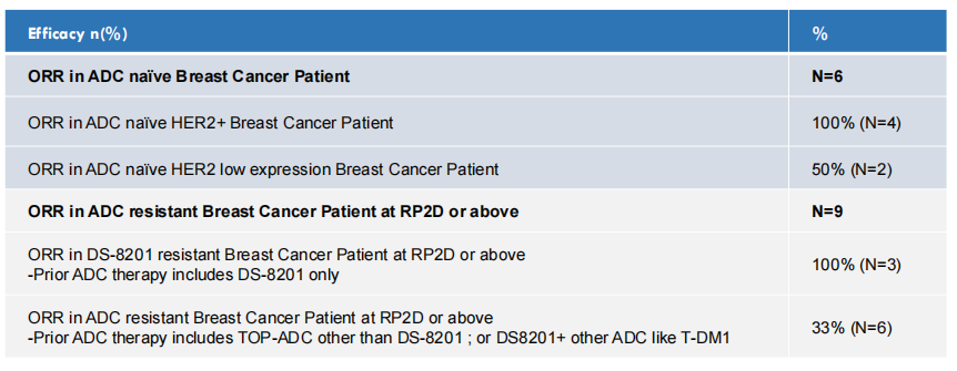 其中3例既往仅接受过DS-8201作为唯一ADC治疗的患者均达到部分缓解(PR,ORR=100%)。