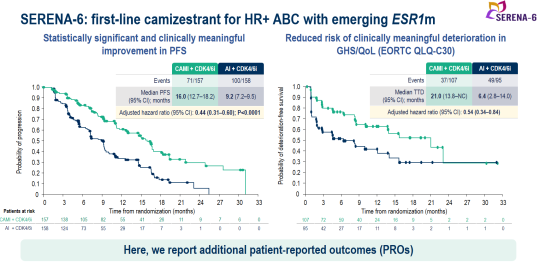 《肿瘤瞭望》:本次ESMO大会上公布了SERENA-6研究PRO数据,结果显示,对存在ESR1突变但无影像学进展的HR+/HER2-晚期乳腺癌患者,一线治疗方案从AI+CDK4/6i转为Camizestrant+CDK4/6i,不仅延长了PFS,还显著改善了患者生活质量。请结合相关数据,谈谈这种“在疾病进展前主动换药”的策略,对患者的生活质量带来了哪些实际的影响?