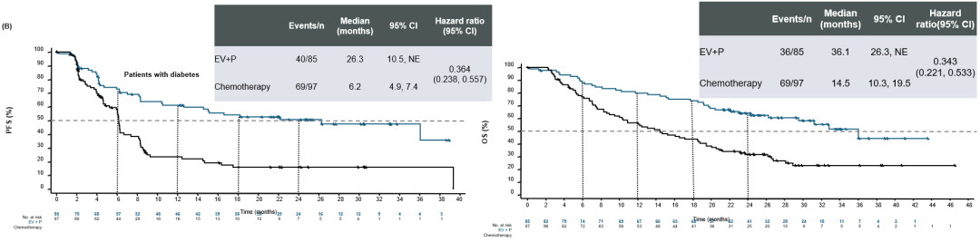对于基线时合并糖尿病的患者,维恩妥尤单抗联合方案组的中位PFS是化疗组的4.2倍(26.3个月vs 6.2个月,HR 0.36),中位OS是化疗组的2.5倍(36.1个月vs 14.5个月,HR 0.34),ORR同样实现了翻倍(69.9%vs 35.4%)[5]