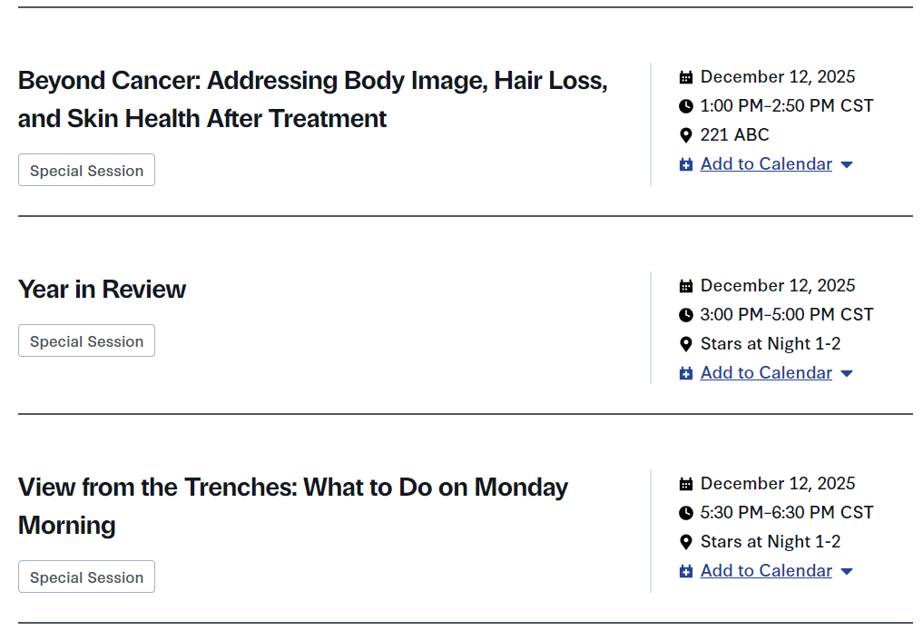 三场特殊专场:1、超越癌症:处理治疗后的身体形象、脱发和皮肤健康问题;2、年度回顾;3、一线实战指南:周一清晨的肿瘤诊疗策略。