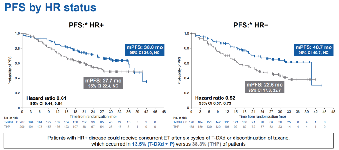 同时,HR表达状态也不会影响T-DXd+P方案治疗获益:DB-09研究允许HR+/HER2+患者在T-DXd治疗6个周期后或THP组停用紫杉后联合内分泌治疗,设计符合当前临床实践,实际两组联合内分泌治疗的比例为13.5%和38.3%;而根据HR表达状态进行的亚组分析显示,T-DXd+P方案较THP方案使HR+/HER2+患者疾病进展或死亡风险显著下降39%(mPFS,38.0个月vs 27.7个月,HR 0.61,95%CI:0.44-0.84),CR率则是THP组的2倍(14.5%vs 7.2%),且T-DXd+P方案的PFS获益幅度与HR阴性、不符合内分泌维持治疗条件的患者相当(HR 0.52)。