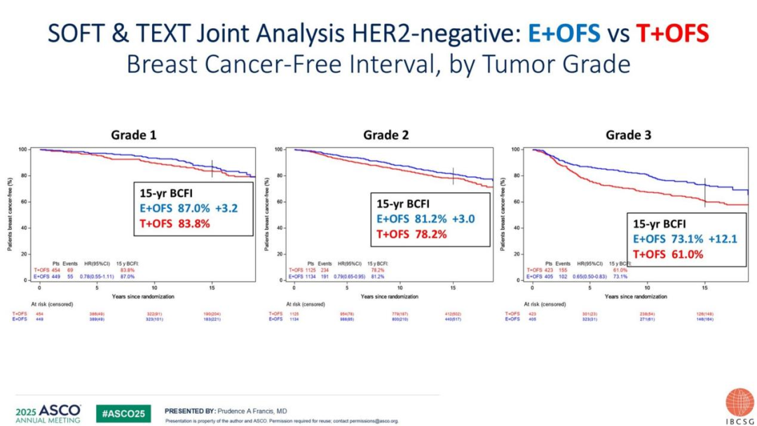 组织学分级高(G3):对于G3肿瘤患者,OFS+依西美坦相较于OFS+他莫昔芬在15年无乳腺癌间期(BCFI)上实现12.1%的绝对获益,OS亦有4.5%的绝对改善[11]