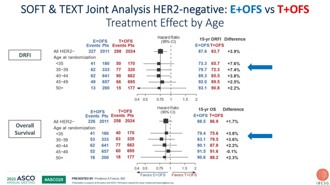 图2.SOFT&TEXT研究绝经前HR+/HER2-乳腺癌患者中不同亚组E+OFS与T+OFS治疗方案长期疗效比较[11]