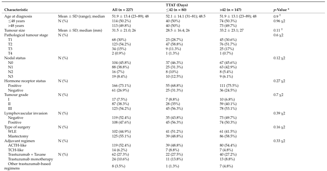 研究筛选了数据库的3135名患者,纳入符合标准的227名患者进行分析。从最初诊断乳腺癌到开始使用曲妥珠单抗的中位时间为49天。根据TTAT将研究人群分为两组;80名患者(35.24%)为≤42天亚组,147名患者(64.76%)为>42天亚组。组间的年龄(P=0.9)、肿瘤大小(P=0.96)、T分期(P=0.6)、N分期(P=0.12)、激素受体状态(P=0.27)或肿瘤分级(P=0.7)方面没有统计学上显著差异。组间的手术类型(P=0.16)或辅助治疗方案(P=0.33)方面也没有显著差异。