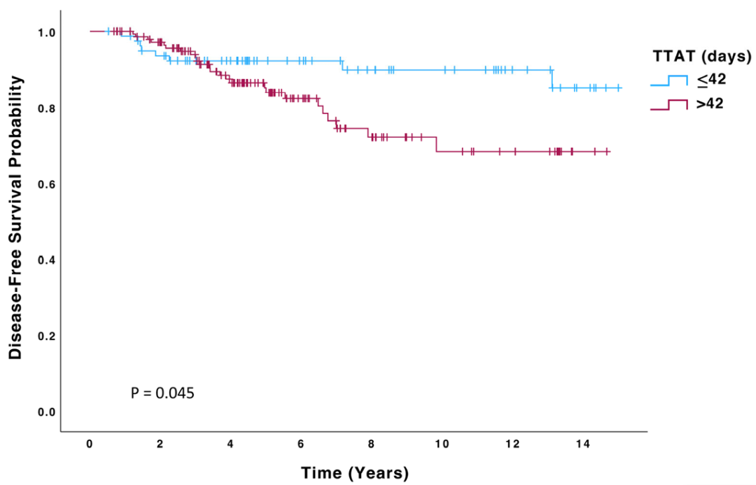 这是一项来自爱尔兰的单中心回顾性研究,分析了手术治疗后接受曲妥珠单抗辅助治疗且未接受过新辅助治疗的HER2阳性乳腺癌患者。患者根据术后至曲妥珠单抗辅助治疗时间(TTAT),分为TTAT≤42天或TTAT>42天两组。TTAT定义为HER2阳性浸润性乳腺癌初次手术至开始曲妥珠单抗辅助治疗的时间间隔。关键终点包括总生存(OS)、无病生存(DFS)和无远处转移生存(DMFS),通过Kaplan-Meier和Cox回归分析进行评估。